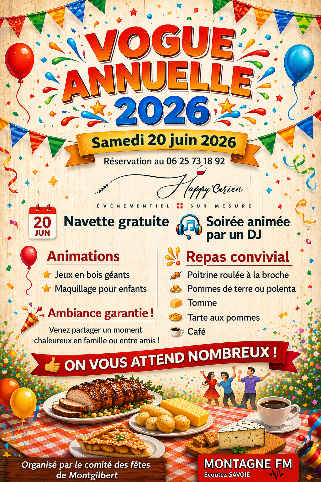 Le Comité des fêtes de Montgilbert vous invite à sa Vogue annuelle : jeux en bois géants, maquillage pour enfants, ambiance conviviale, repas de poitrine roulée à la broche avec polenta ou pommes de terre, suivi d’une soirée animée par un DJ ! Repas: